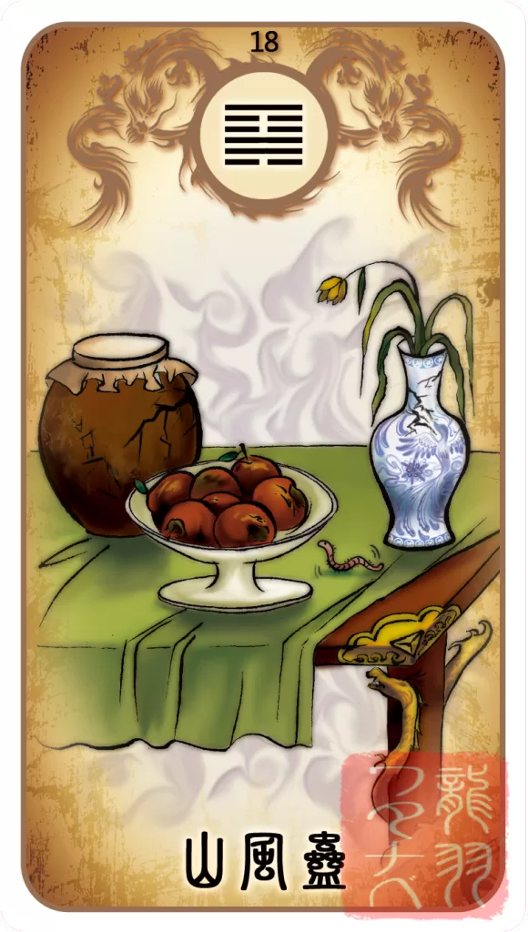 「蠱」という文字は、見慣れない漢字ですが、皿の上に3匹の虫で構成されています。腹の中の虫と言う意味で、虫が内部からわく事、つまり、腐敗、崩れ、破壊の卦です。政治・経済・文化・会社・家庭などが何かの事情で乱れる事を示唆しています。これは、言うまでもなく凶の卦ですが、腐敗をいつまでも放置する事が一番良くありません。逆に、この凶を打破する事で、新たな希望を見いだせるチャンスでもあります。腐敗した部分を切り捨て、新しいものに再建すると言う事です。一刻も早く腐敗を止めるための行動に出て、転じて、リセット、再生するべきです。