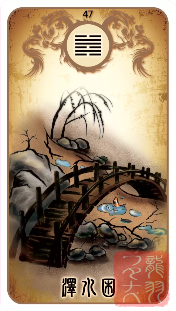「困」は、困難や困窮、貧困の困で、非常に苦しい状態を表しています。何をやっても上手くいかない厳しい局面にあり、次から次にと問題が勃発するような状態にあります(四難卦:坎為水、水雷屯、水山蹇のひとつ)。このような時期、自暴自棄にならずに耐え忍び、運気の好転を待つしかありません。『易経』には、「言うことあるも信ぜられず」とあります。つまり正しいと思うことを主張してもそっぽを向かれるようなものです。このような時期、自暴自棄にならずに耐え忍び、運気の好転を待つしかありません。このような事態を受け入れ、自分の信念をもって努力し続けることが、唯一、この難局から脱出できる方法です。