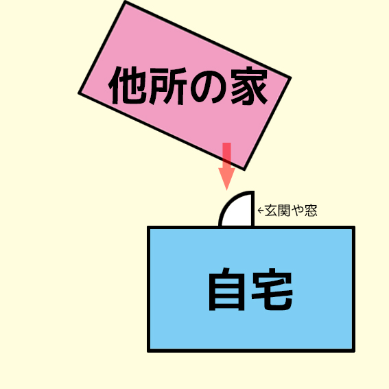 玄関前、またはベランダの正面に尖ったものが向いている屋根の鋭角な部分、隣家の壁…