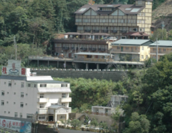 道路を挟んで建造物の正面及び周辺環境が崖になっている。山間部や温泉街によくある。急な崖はまるでその…