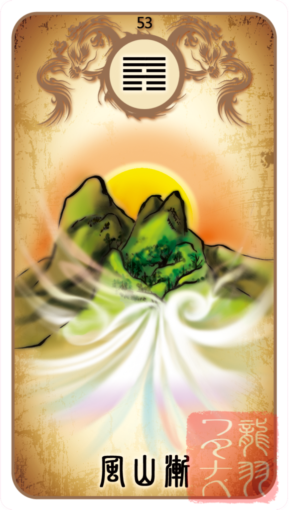 「漸」とは、漸次という言葉の様に、徐々に進む、順を追ってゆっくりと進むといった状態や状況を意味します。一気に進みたいかもしれませんが、吉の卦とはいえ、あくまでも、だんだんと運気上昇するのですから、焦ってはいけません。「千里の道も一歩より」というように努力を積み重ねることで好運をとらえることができるのです。猛進することで、せっかくの良い状態が崩れ、痛い思いをする可能性があります。行動は、あくまでもゆっくりと順序を正しく踏んで進むべきです。なお、六十四卦のうち「進む」という意味の卦は三つあります。「進む」スピードは、順番に<晋>→<升>→<漸>→となります。