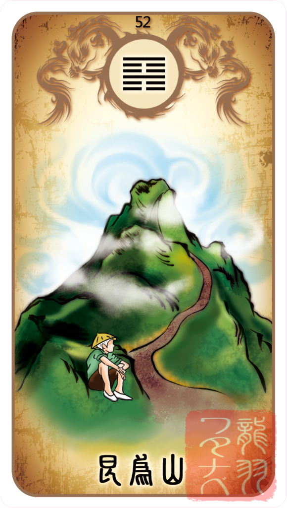 「艮」とは、止まる、止めるという意味で、その場に留まり、動きがないということです。この艮が、上下に重なっていますので、全く動きがない状態を大切にする様に働きかけている卦です。世の中の常識として、動きがないよりも動きがある事、つまり、消極的でいるよりも積極的でいる事の方が評価されがちです。しかし、場合によっては、動かない事を選択する事も大切です。但し、この不動は、一時的な休息・休眠であり、その後の活動のための大切な充電期間です。